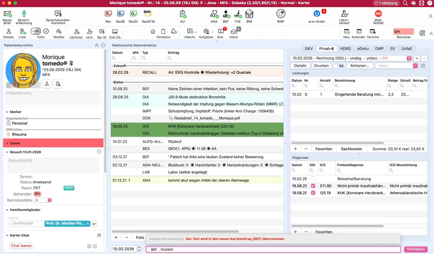 Dank praktischer Features, wie Künstliche Intelligenz, Serienbriefen, Textbausteinen, Vorlagen, der Spracherkennung und ImpfDocNE gelingt Ihnen die Dokumentation im Handumdrehen. tomedo® ist als Praxisinformationssystem optimal an die TI angebunden, wodurch auch eArztbriefe und elektronische Patientenakten (ePA) mit nur wenigen Klicks befüllt bzw. verschickt werden können.
