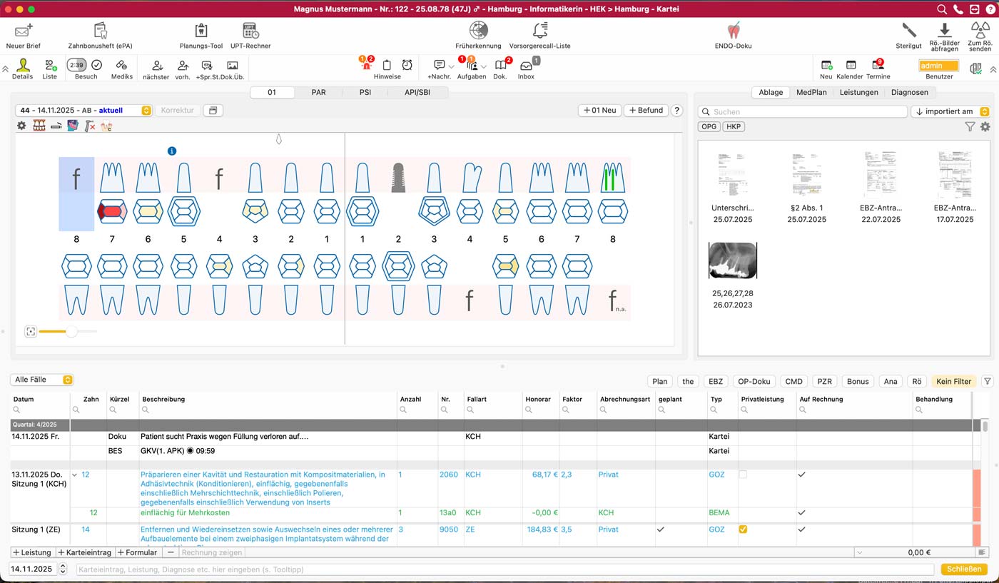 Eine lückenlose und forensisch sichere Dokumentation leicht gemacht: Hier liegen Ihre Befunde, Diagnosen, Röntgenbilder, Leistungsziffern und vieles mehr.
